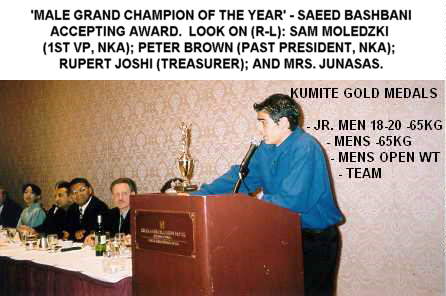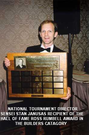 Banquet Head Table.   National Tournament Director, Sensei Stan Janusas - Recipient of the Hall of Fame Ross Rumbell Award, "Builders" category.   Saeed Bashbani - Male Grand Champion of the Year.