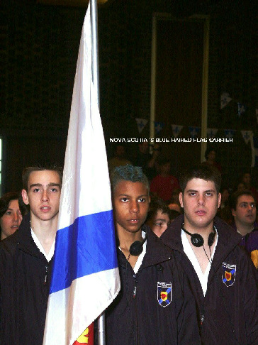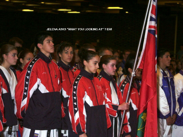 Team Nova Scotia.   Jelana asks, 'What are you looking at, eh?'   Karl says, 'Hi!'.
